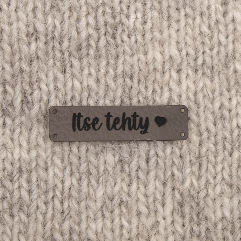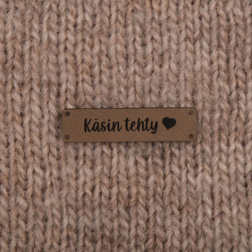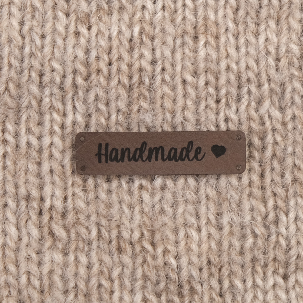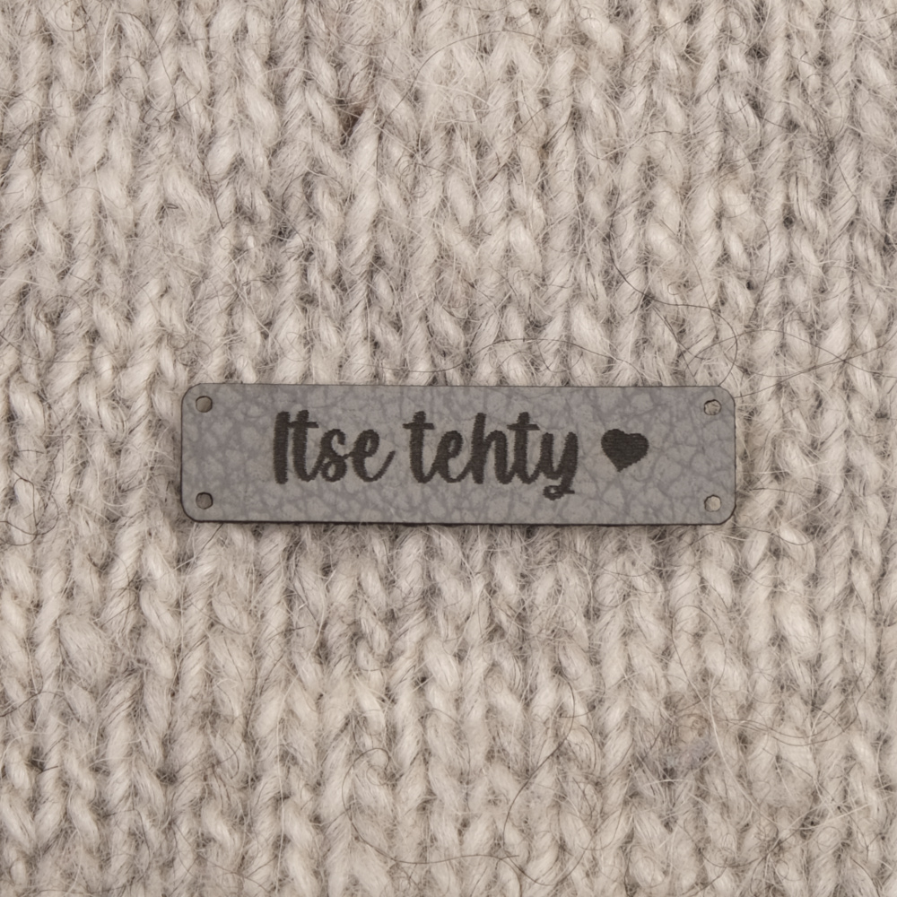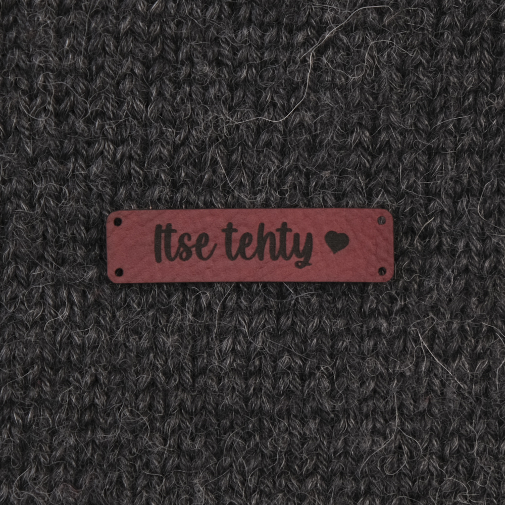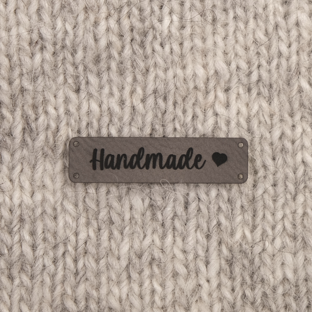 Keinonahkaan kaiverrettuja ommeltavia Handmade-merkkejä neuletyösi yksilöimiseen.