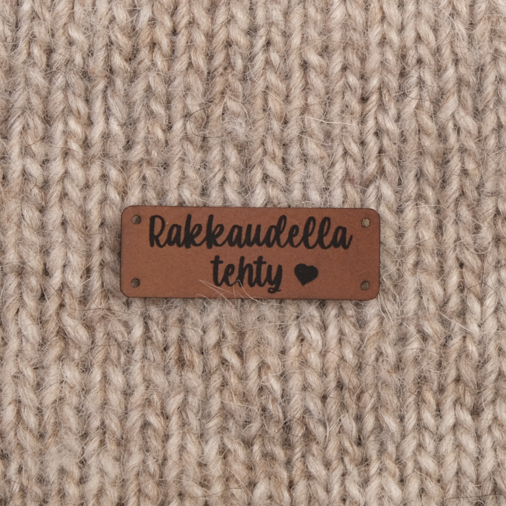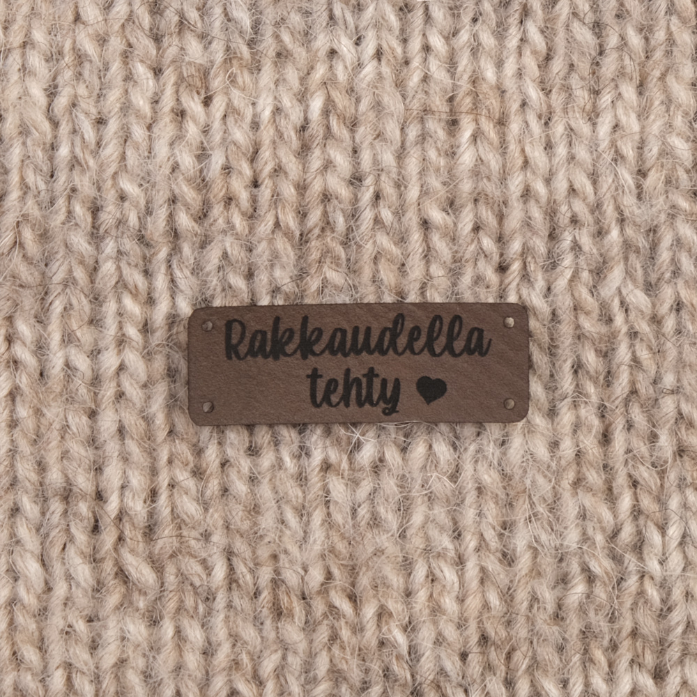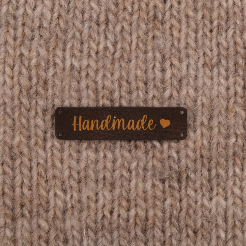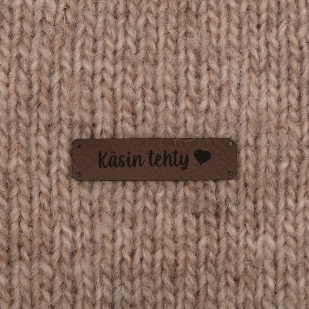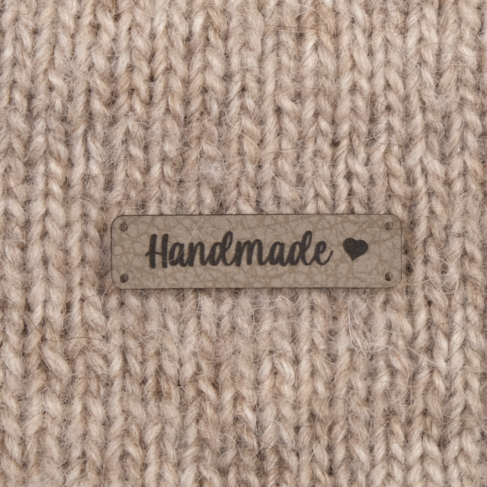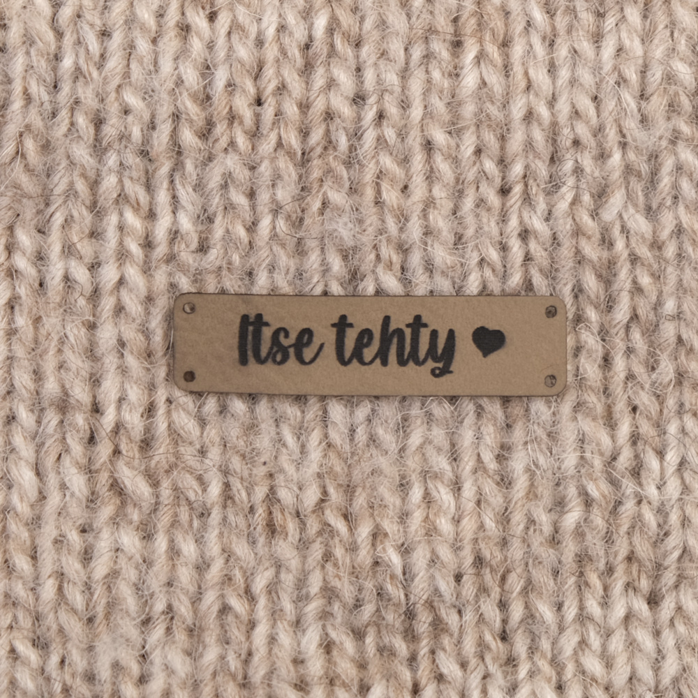 Keinonahkaan kaiverrettuja ommeltavia Handmade-merkkejä neuletyösi yksilöimiseen.