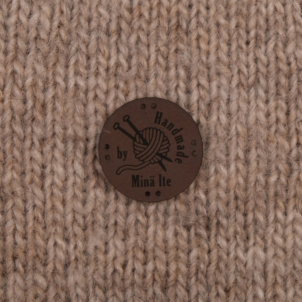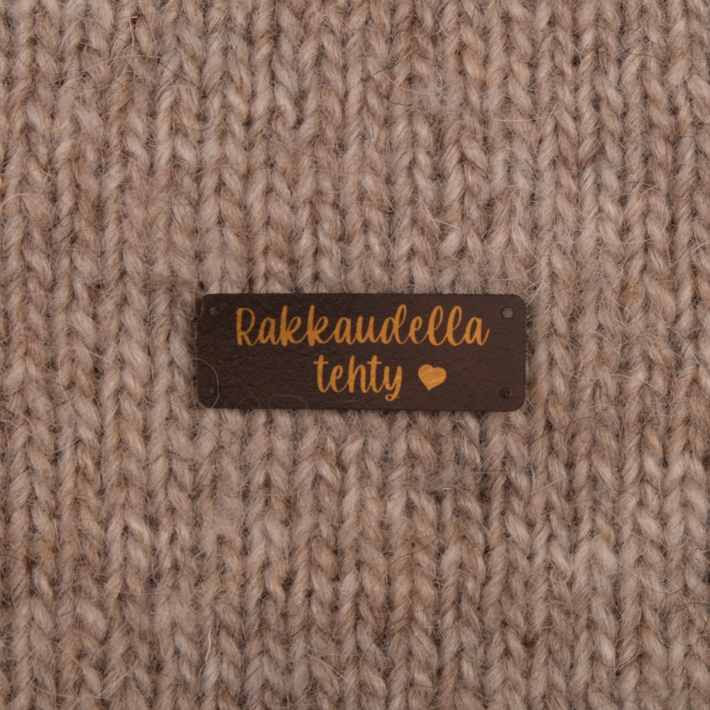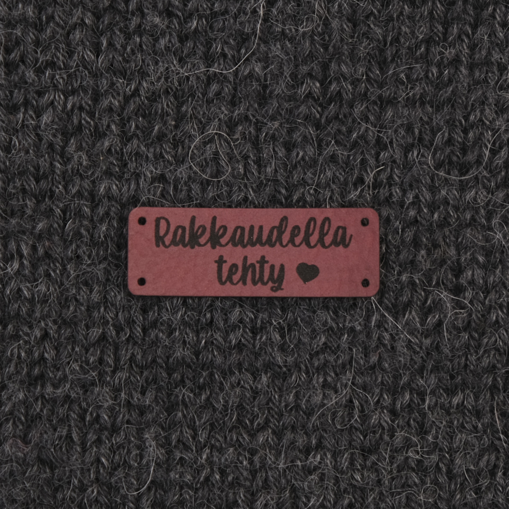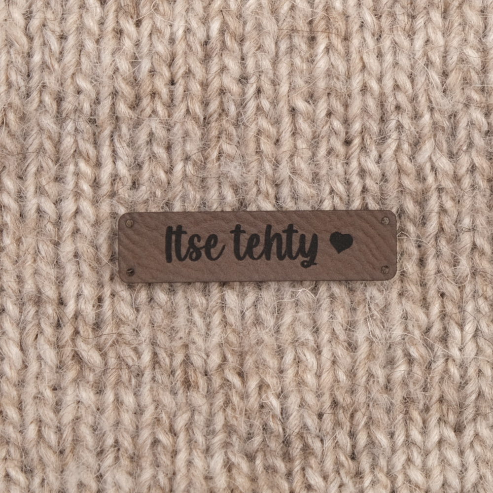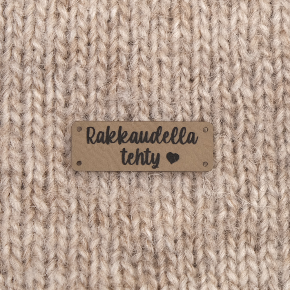 Keinonahkaan kaiverrettuja ommeltavia Handmade-merkkejä neuletyösi yksilöimiseen.