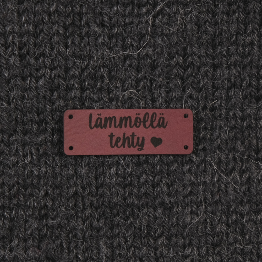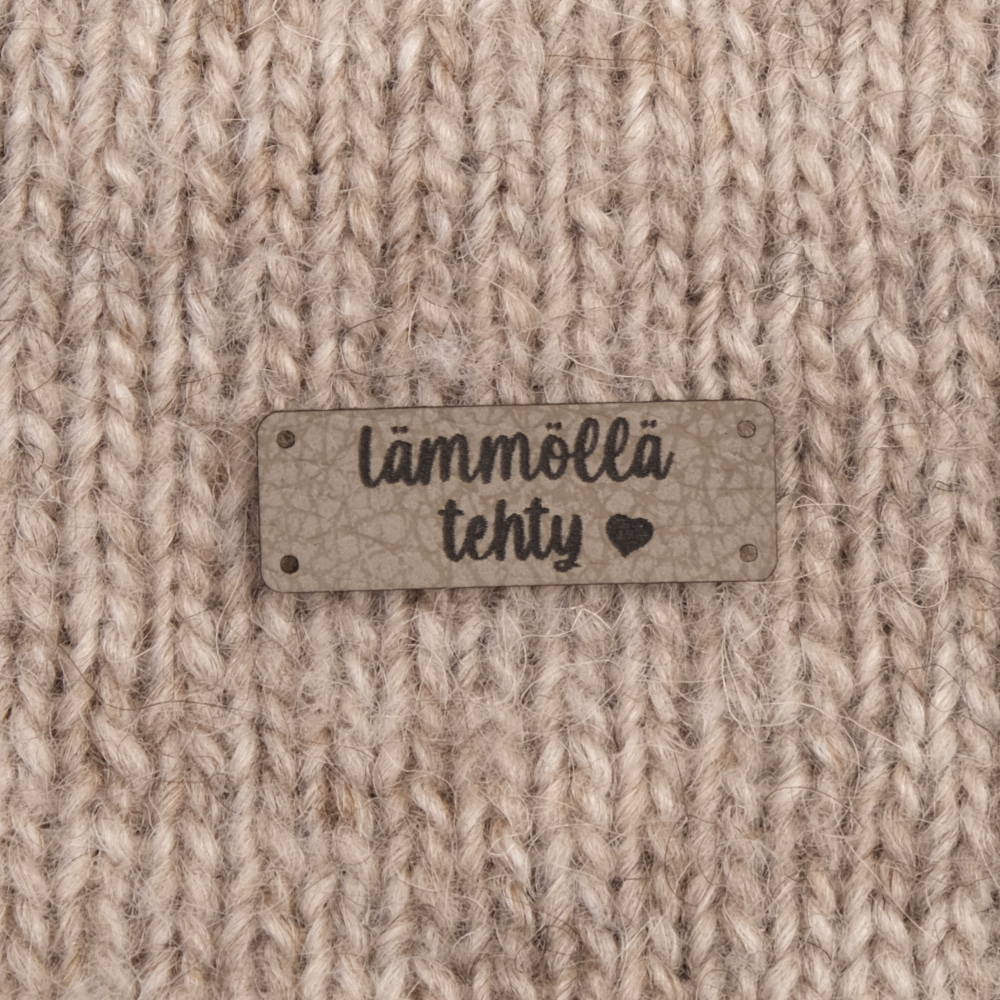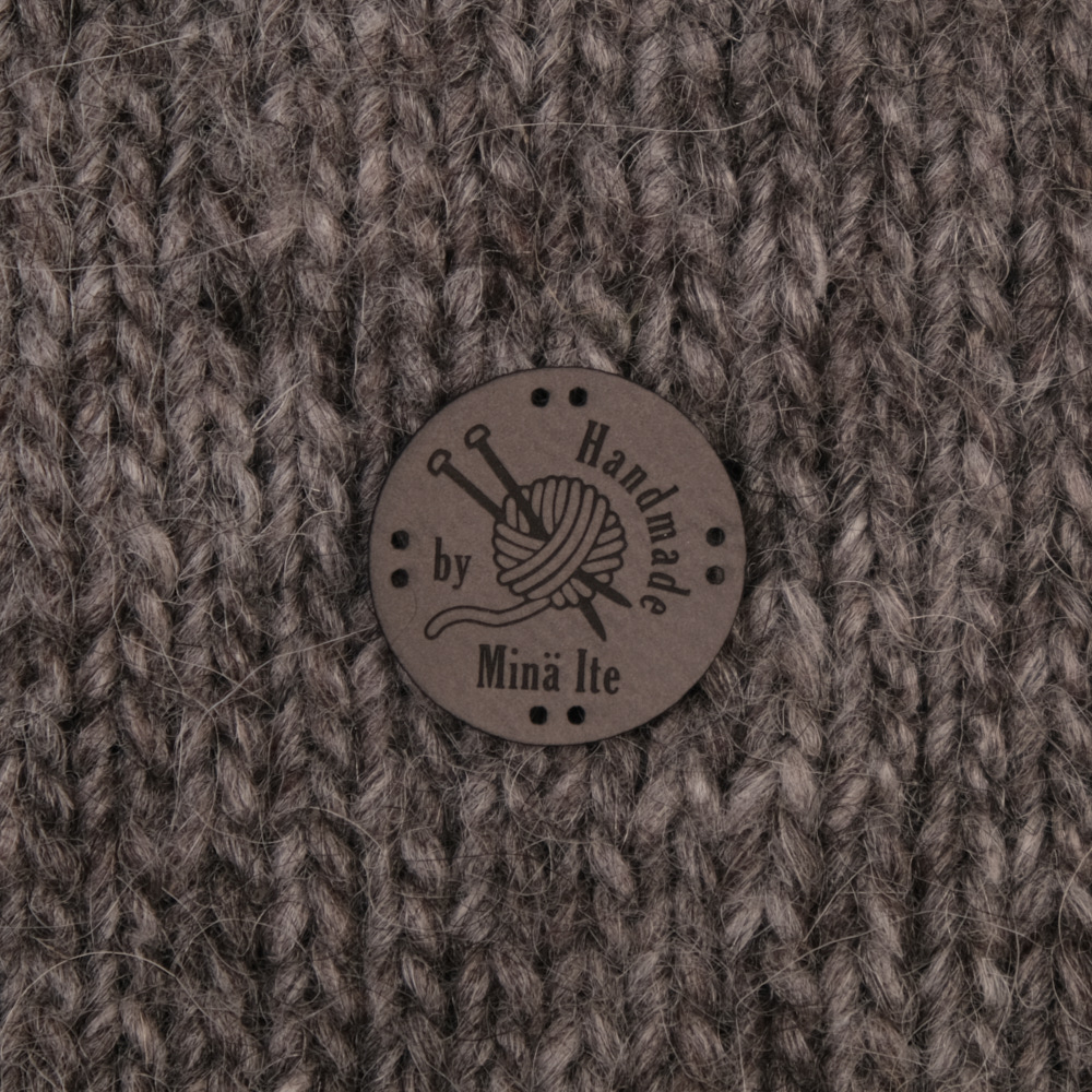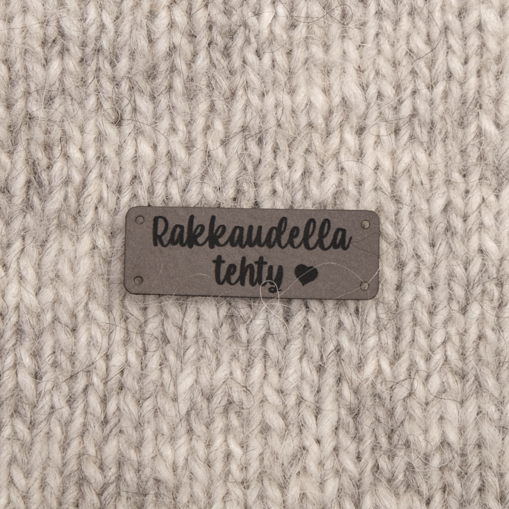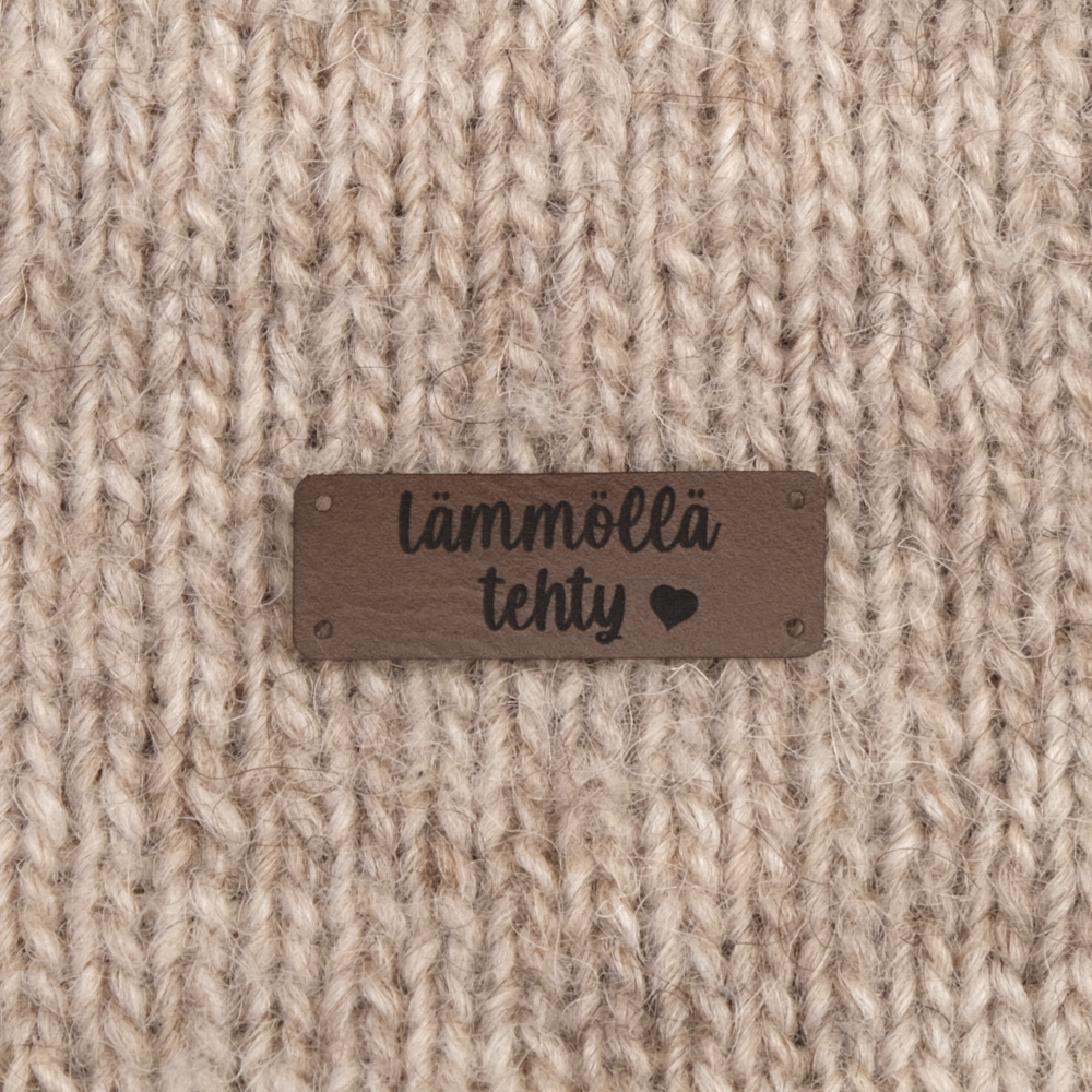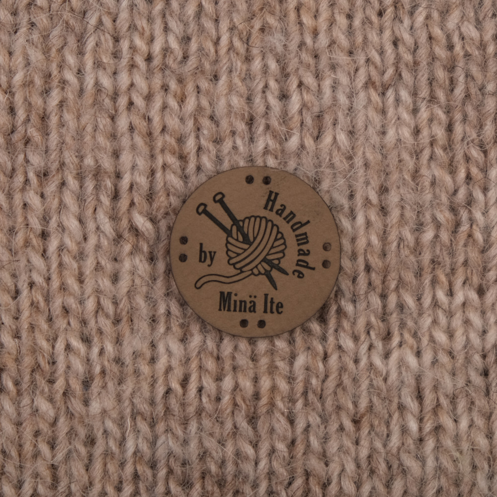 Keinonahkaan kaiverrettuja ommeltavia Handmade-merkkejä neuletyösi yksilöimiseen.