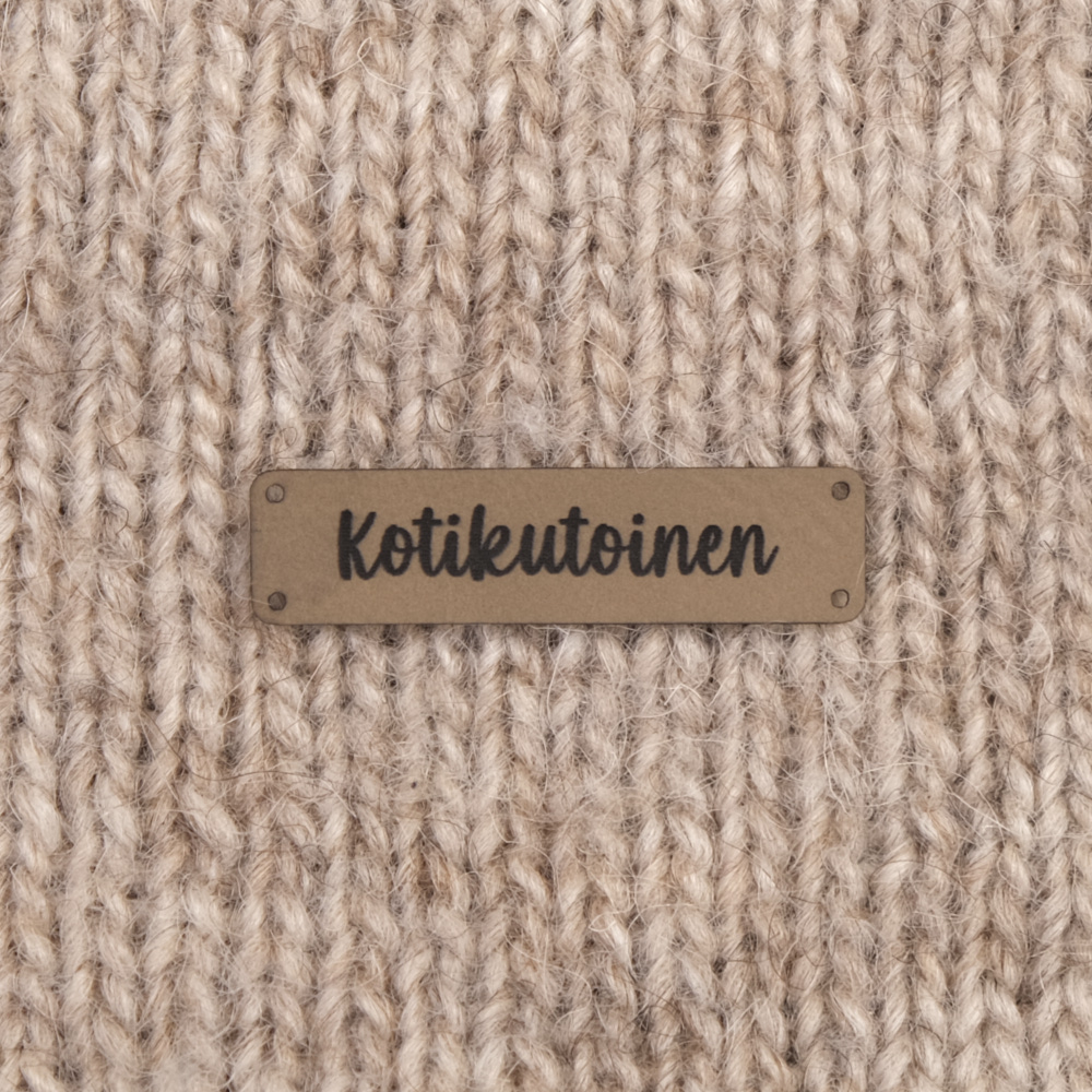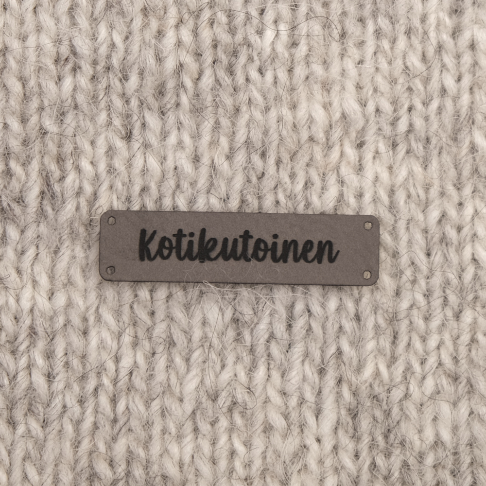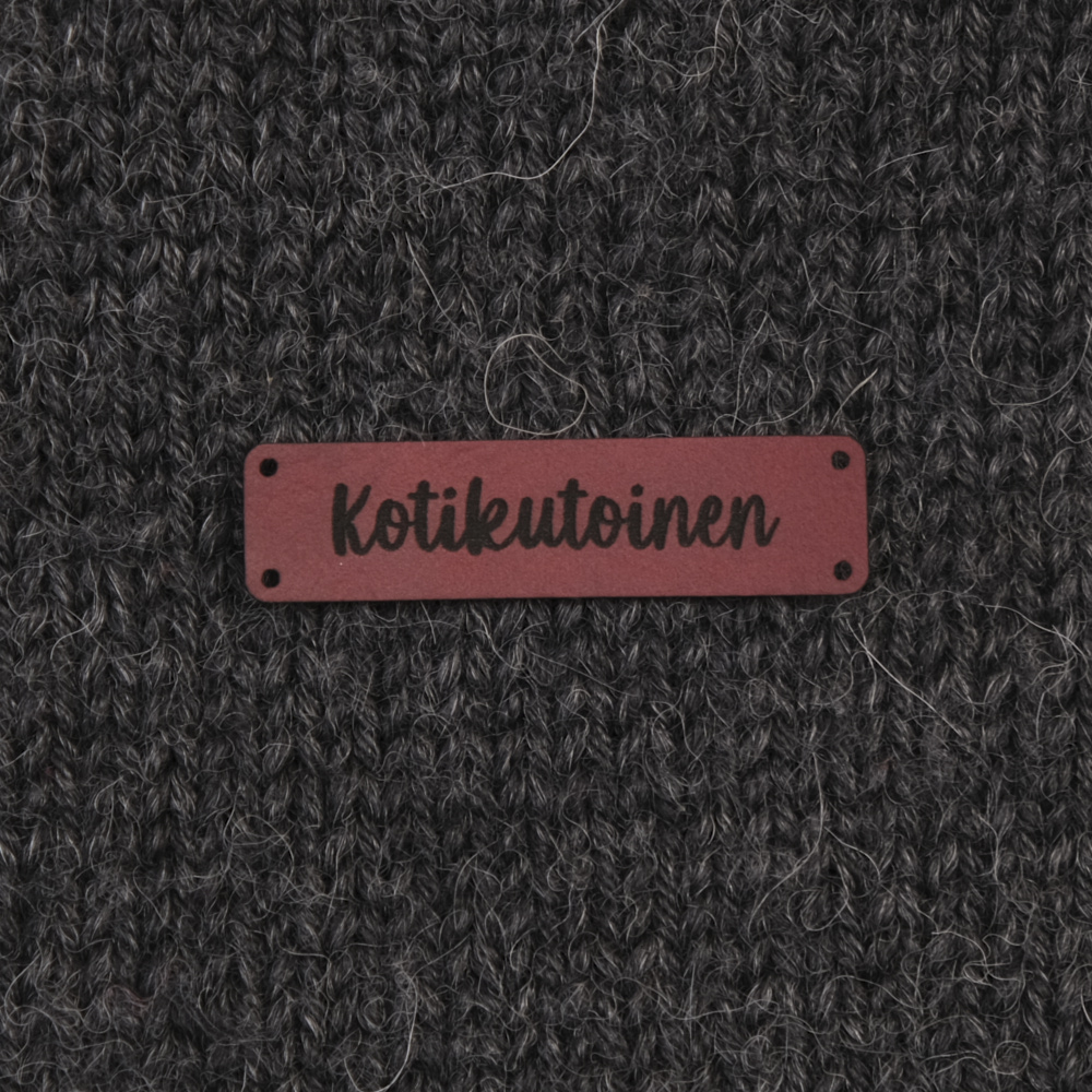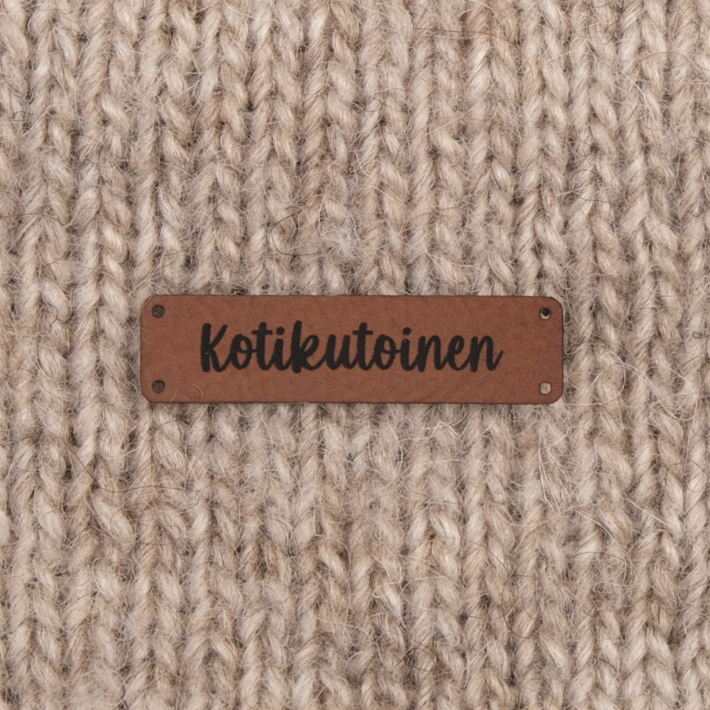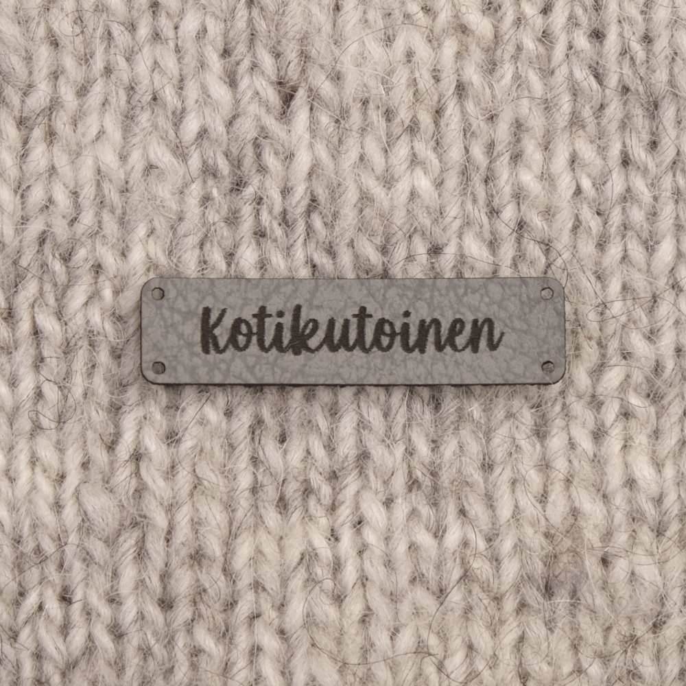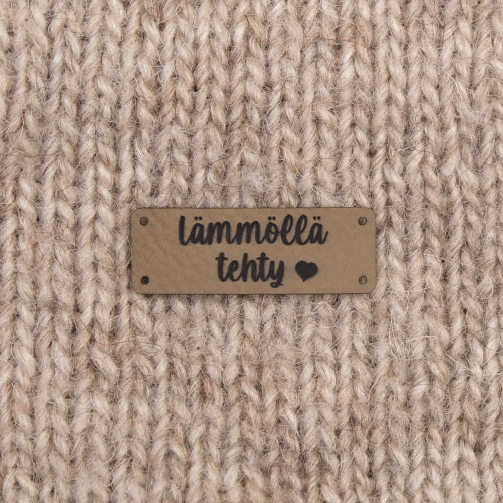 Keinonahkaan kaiverrettuja ommeltavia Handmade-merkkejä neuletyösi yksilöimiseen.