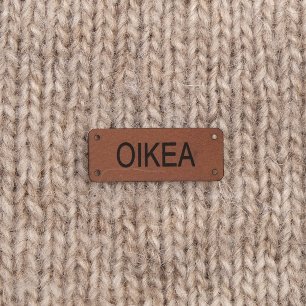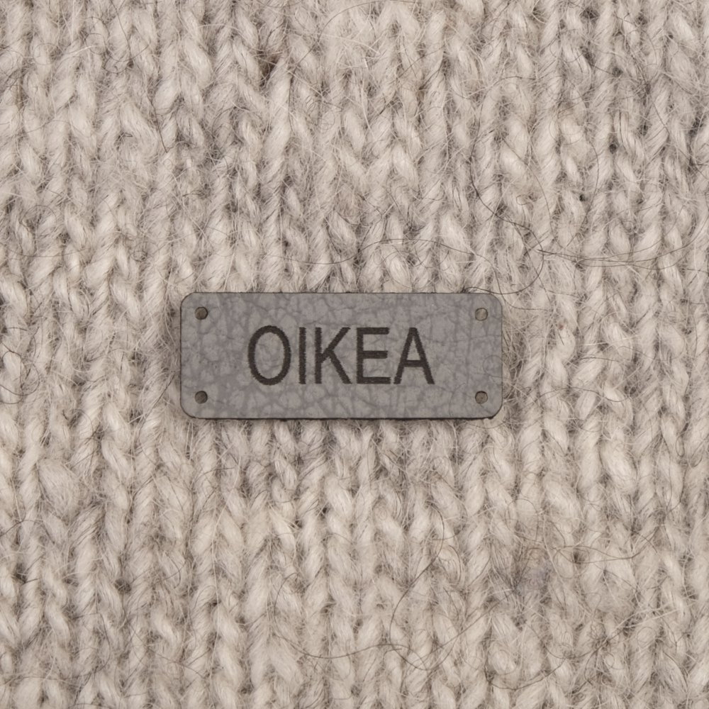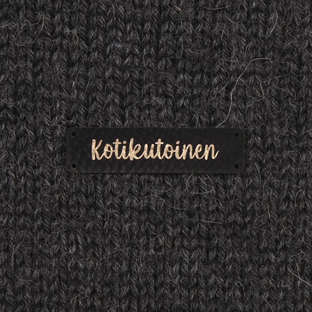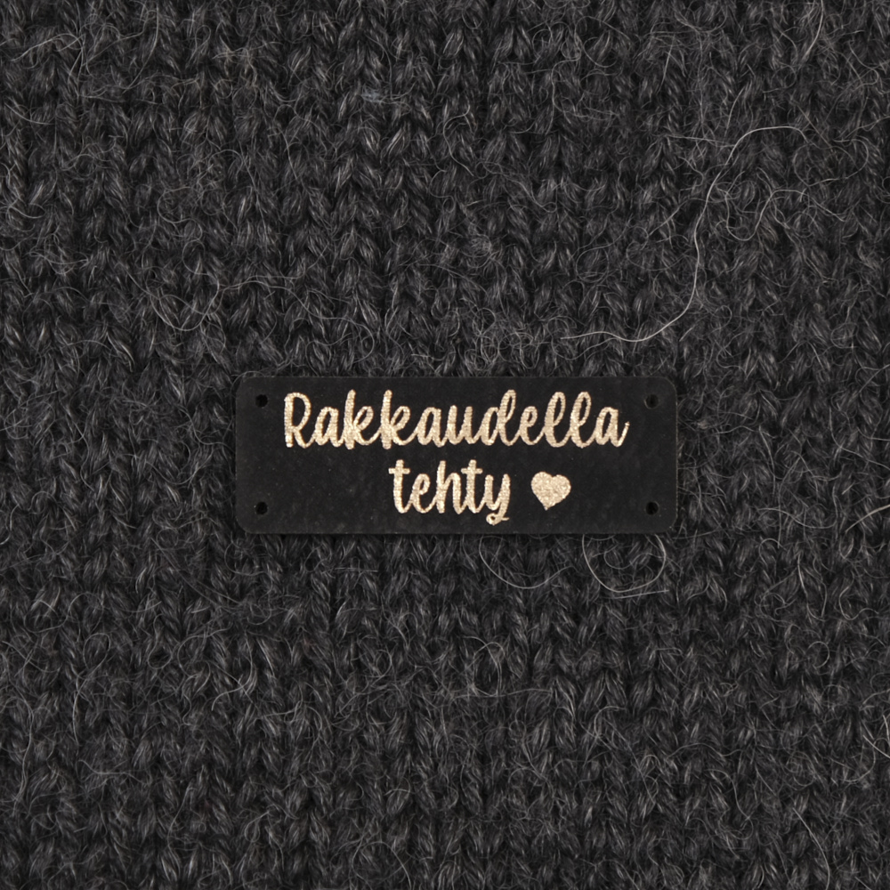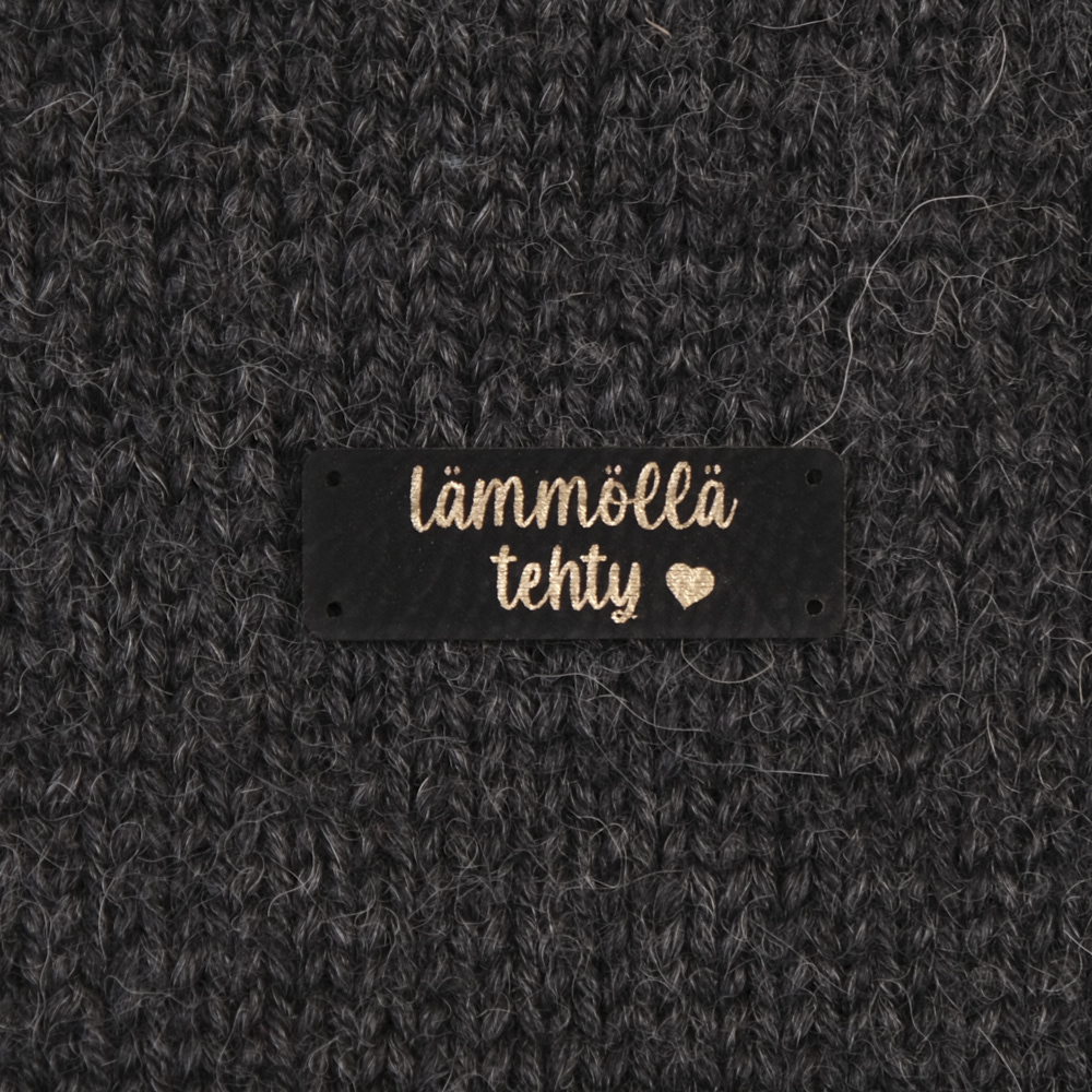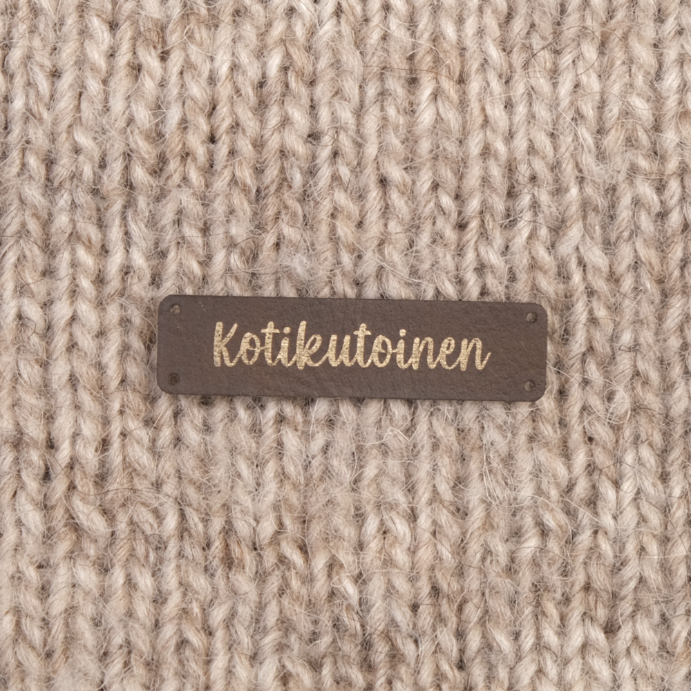 Keinonahkaan kaiverrettuja ommeltavia Handmade-merkkejä neuletyösi yksilöimiseen.