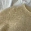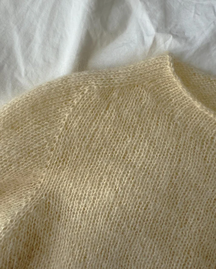 Tarvikkeet: 140 (160) 160 (180) 180 (200) 200 (220) 220 (240) g Krea Deluxe Silk Mohair (20 g = 240 m) tai 175 (200) 200 (200) 225 (225) 250 (275) 275 (300) g Knitting for Olive Soft Silk Mohair (25 g = 225 m) tai 200 (200) 225 (250) 250 (275) 275 (300) 300 (325) g Sandnes Garn Tynn Silk Mohair (25 g = 212 m) tai Isager Yarn Silk Mohair (25 g = 212 m). Koko pusero neulotaan kaksinkertaisella langalla. Ilmoitettu lankamäärä on tarvittava kokonaismäärä.