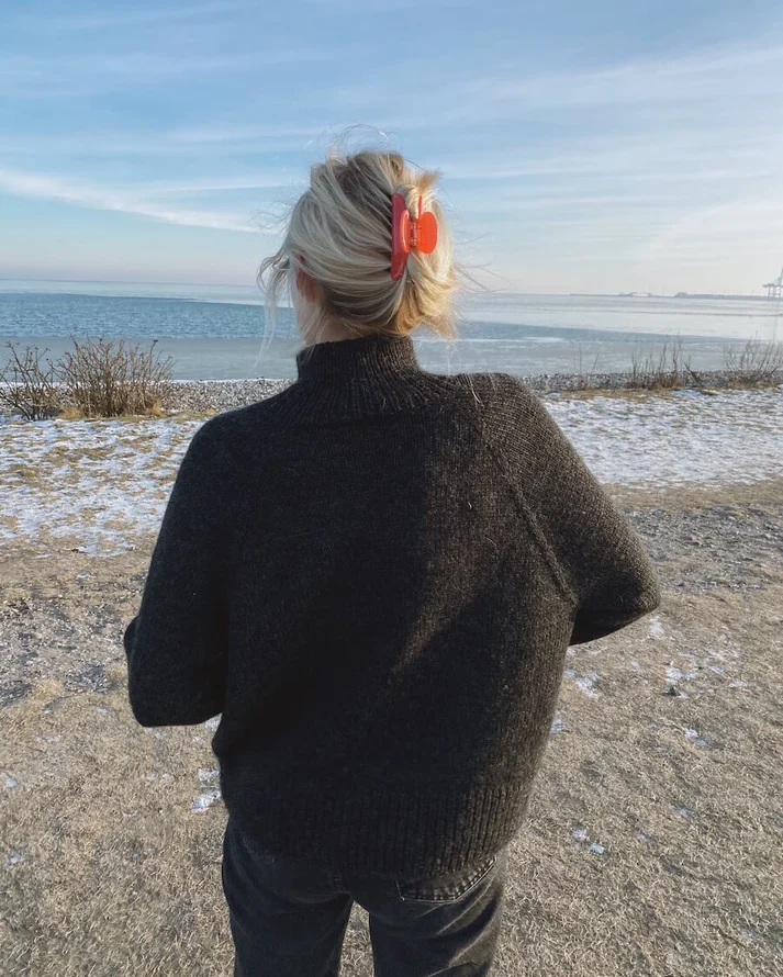 Louvre Sweater neulotaan ylhäältä alas. Pääntietä muotoillaan joustimen jälkeen lyhennetyin kerroksin, ja kaarrokkeessa tehdään raglanlisäyksiä.