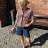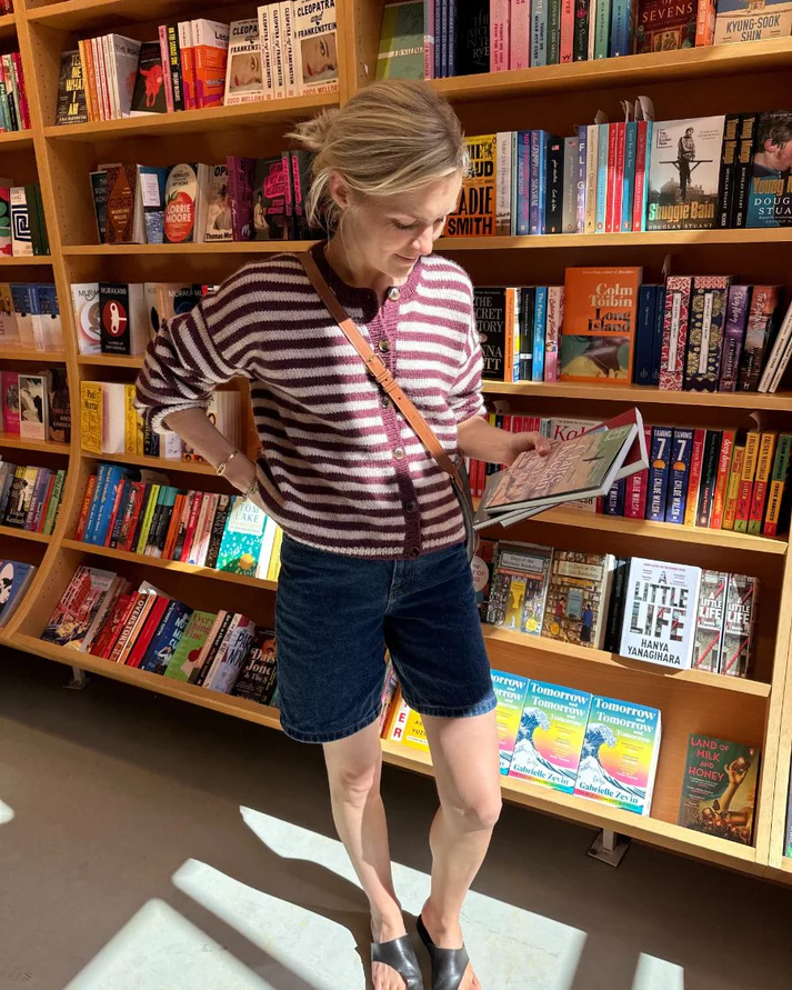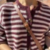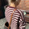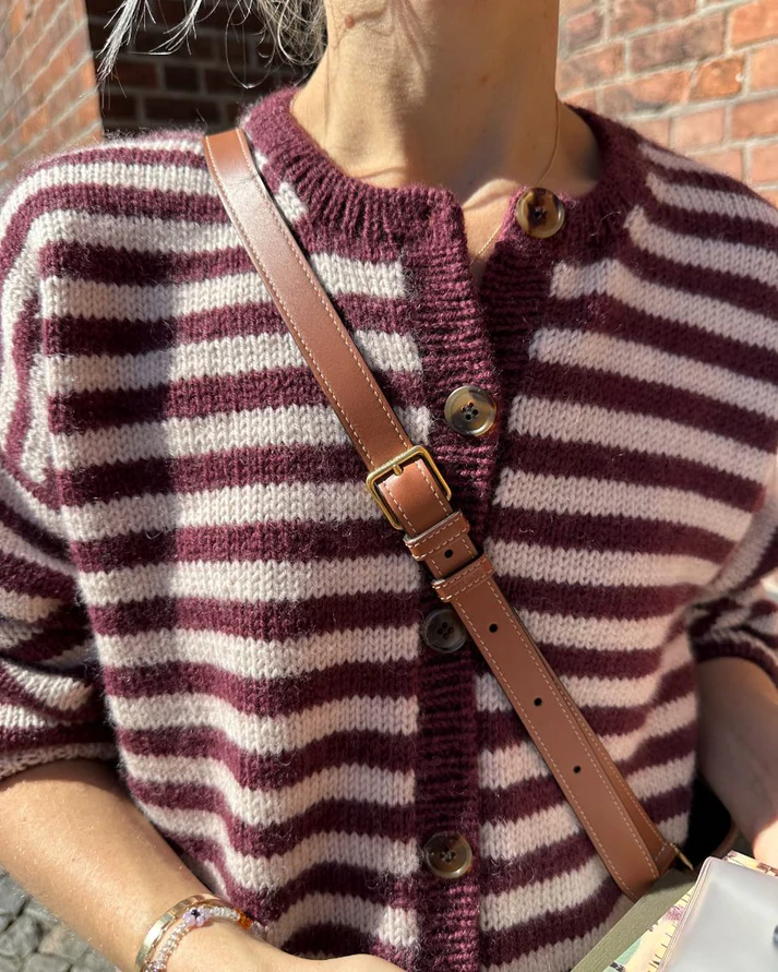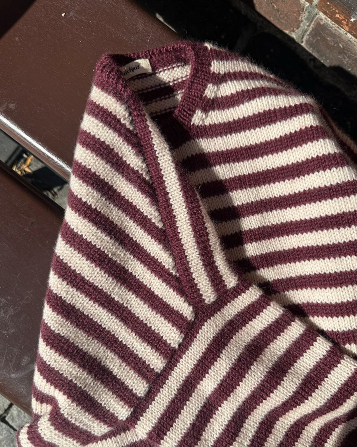 Kuvan burgundi ja valkoinen Olga Jacket on neulottu Sandnes Garnin Peer Gyntistä väreissä Vinrød [4363] ja Almond [2511].