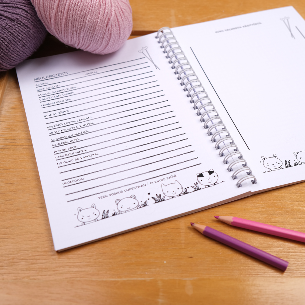 uusi harrastus. Sinä, joka olet pitkään etsinyt, mutta et ole mistään löytänyt. Minua. Sellaista kirjaa, jonka kansien sisään voisit tallentaa hulluimmatkin neulesuunnitelmasi ja toteutuneet unelmasi, ne kaikista toimivimmat neuleohjeet, kuviot, niksit. Ja myös sen, mitä ei ehkä kannata enää uudelleen tehdä. Jonka sivuille voisit aina palata muistelemaan, kertaamaan, haaveilemaan ja ylpeänä itsestäsi ihastelemaan. Nyt sinä löysit minut. Ota minut mukaasi ja aloitetaan yhteinen matkamme.”